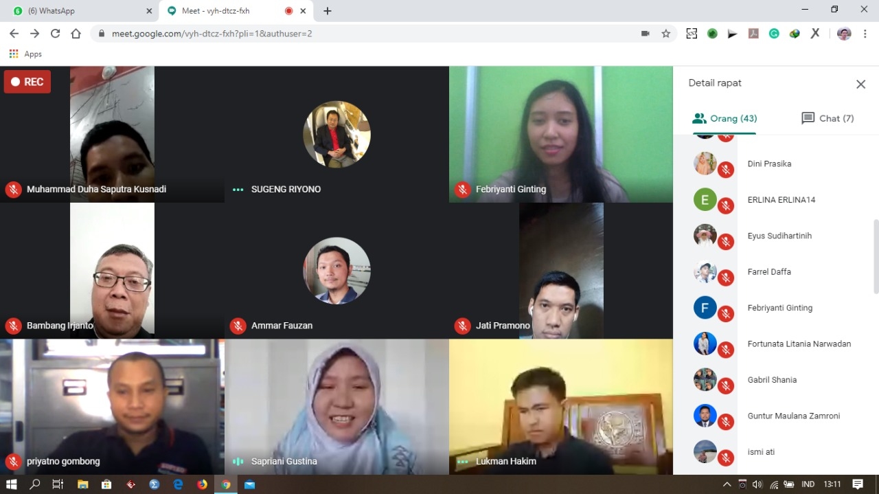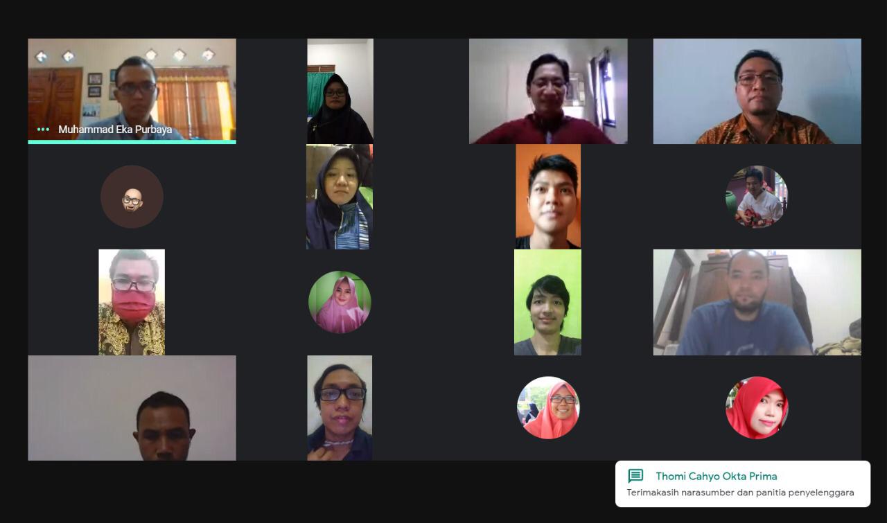 Peserta zoom meeting pada Seminar ini dihadiri oleh Dosen dan Mahasiswa Prodi IT UP45YK, Dosen dan Mahasiswa IT dari Unisa Yogya; UTS NTB; Dosen dan Mahasiswa serta praktisi IT yang berasal dari Sabang sampai Merauke dari Miangas sampai Pulau Rote. Sebelum Seminar dimulai Dekan Fakultas Teknik Bapak Dr. Ir. Sugeng Riyono, M.Phil meberikan kata sambutan. Dari Screenshoot Meet Google bisa kita lihat kedua Narasumber, Moderator, KaProdi IT UP45YK, MC dan seluruh peserta Webinar.